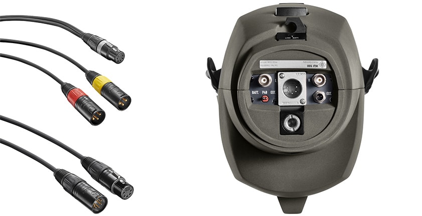 バイノーラル収音された音声は、 底面の5ピンXLR端子を経由したバランス出力、またはBNC端子を経由したアンバランス出力となります。5ピンXLR端子出力を2つの3ピンXLR端子出力に変換するケーブルを同梱しています。