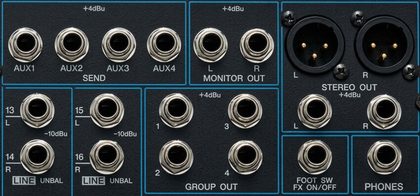 ミキサーのメイン出力(Main Out / Master Out)は、すべての入力チャンネルの音声を最終的に1つにまとめて出します。パワードスピーカーやパワーアンプなどに接続され、会場に流す音の「最終的な音質と音量」を決定します。操作パネル上のメインフェーダー(またはツマミ)で全体の音量を一括管理します。