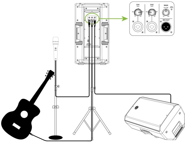 追加でもう1台のThrashをモニター用途として接続することができます。メインPAとして使用しているThrashのMIX OUT端子からモニター用 ThrashのCh.1の入力端子へケーブルを接続するだけです。モニター用 ThrashのCh.1のGAINノブは「LINE」の位置へ設定してください。