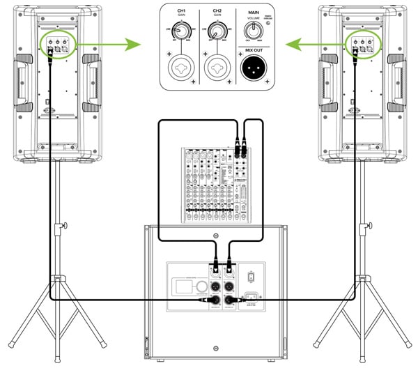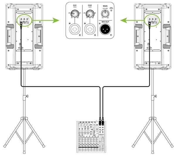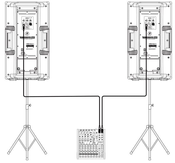 この例では、ミキサー(ProFX10V3)を直接2台のThrash212 GOと接続しています。このセットアップは小さなキャパシティのクラブにぴったりです。ミキサーの出力端子を各 Thrash212 GOのCh.1 入力端子に接続すればOKです。GAINのノブはどちらも「LINE」で揃えます。