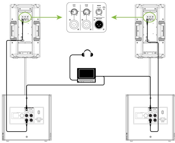この例では、ラップトップが2台のサブウーファー DRM18S のそれぞれのCh.1入力端子に接続されています。またラップトップのフォン入力端子にはヘッドフォンMC-450が接続されています。