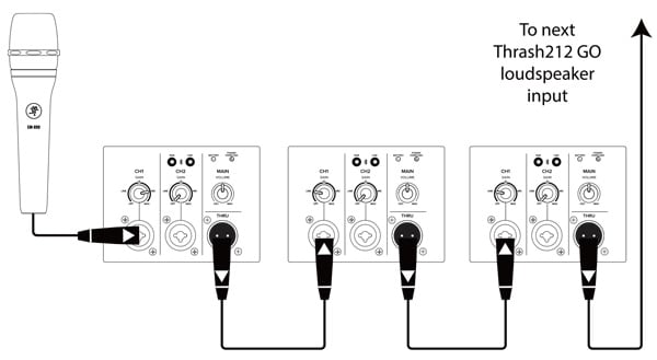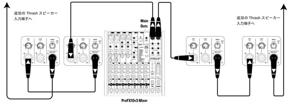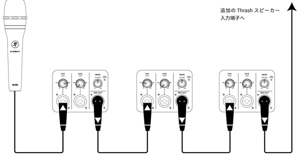 Thrash シリーズは「MIX OUT」と印字されたXLR オス端子を使って、デイジーチェーン接続することができます。音源(ミキサーの出力もしくはマイク)を入力端子に接続し、Thrash の M IXOUT 端子を次の Thrash の入力端子に接続します。これを繰り返し、複数台のスピーカーをデイジーチェーン接続します。上の接続図をご参照ください。