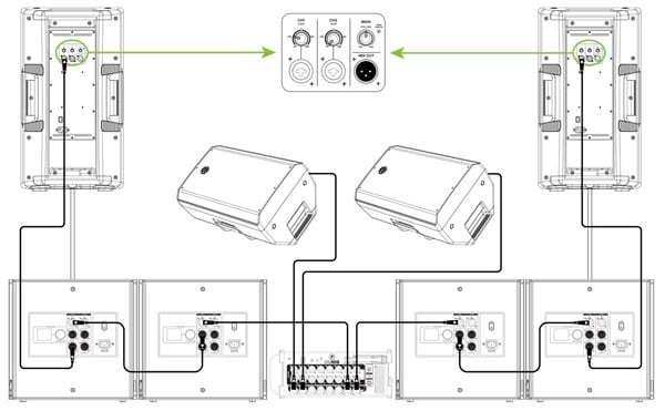 この接続例では、SRM1850 と SRM450v3 を使用してサウンドシステムを構築しています。 小規模クラブに厚みのあるサウンド を提供する理想的なセットアップです。