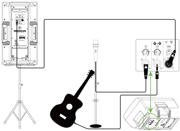この例では、ダイナミックマイク Mackie EM-89DがメインPAとして使用される ThrashのCh.1の入力端子に接続されています。