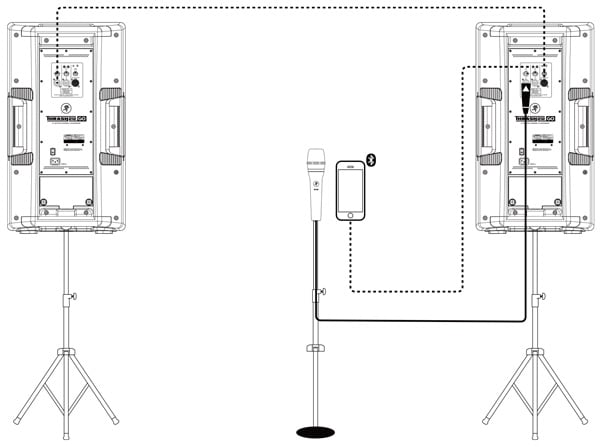 この例では、カラオケ愛好家たちが、信頼性の高い Mackie EM-89D ダイナミックマイクをチャンネル 1 とチャンネル 3 の XLR 入力に接続します。ここから、チャンネル 1 と 3 の入力を必要に応じて設定します。これには、ゲイン/ボリュームレベル、EQ 設定、コンプレッサーレベル、FX(1 と 2)、その他多数の機能が含まれます。さらに、白熱したカラオケ対戦のために、スマートフォンを Bluetooth で接続しています。XLR ケーブルがメインの ShowBox を追加の ShowBox に接続し、パワフルなステレオペアシステムを構築できます!