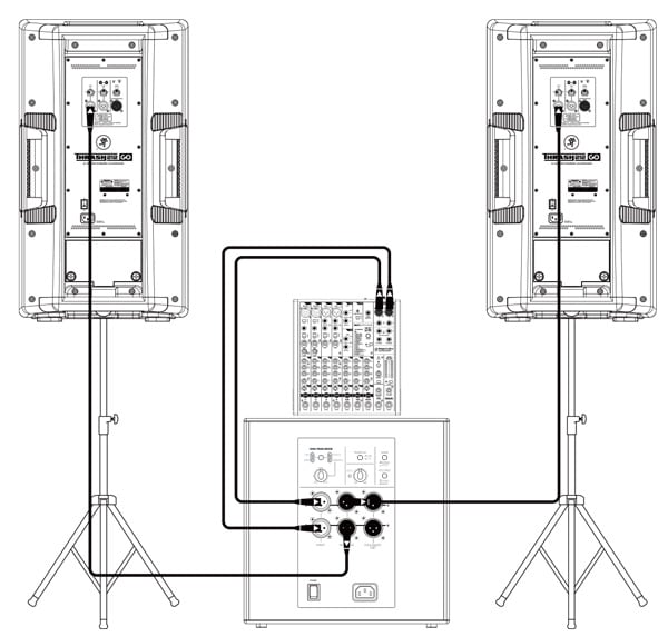 この例では、ProFX10V3が2台のThrashと接続されています。小さなクラブには最適のセットアップです。ここでは、ProFX10V3のL/R 出力が直接両サイドの Thrash の Ch.1入力端子に接続されています。Ch.1のGAINを「LINE」の位置に設定してください。GAINノブの「MIC」と「LINE」マークはあくまで参考値であり、必要に応じて適宜調整してください。