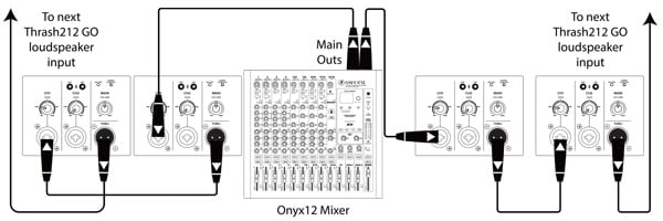 Thrash212 GOは、XLR オスケーブルを「THRU」に接続してデイジーチェーンすることも可能です。ミキサーやマイクなど何らかの音源の出力を、Thrash212 GOの入力端子と接続します。そしてそのThrash212 GOのTHRU端子をもう1台の Thrash212 GOの入力端子にパッチします。この手順を繰り返せば、複数台の Thrash212 GOをデイジーチェーンできます。上の図を参考にしてください。