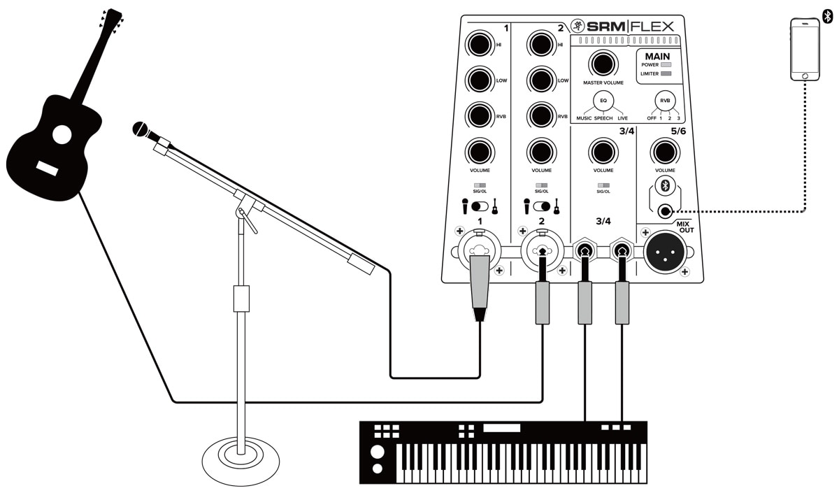 ここでは、マイクがSRM-Flex のCh.1 に接続され、XLR 入力端子上にあるマイク- ライン/Hi-Z スイッチを左側(マイクのアイコン側)にセットしています。このマイクは新郎新婦のために用意される特別なマイクとなることでしょう。披露宴の司会者が「新郎新婦のはじめての共同作業です。」と来賓の方々を盛り上げるためにアナウンスするために使われることでしょう。新婦の親友の余興で、てんとう虫が主役の歌を歌い始めても我慢して聞いていてくださいね。SRM-Flex から流れるサウンドは最高ですから!