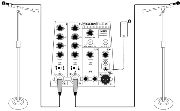 この接続例ではマイクをチャンネル 1 とチャンネル 2 の XLR3 ピン入力へ接続します。プレゼンとカラオケ用の音源が入ったスマートフォンを Bluetooth(もしくは 1/8 インチステレオミニ端子)に接続します。レベルは P.11 の手順に従って調整します。