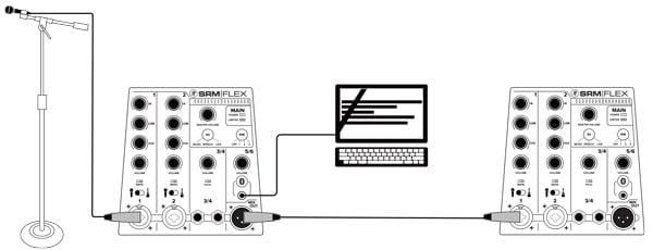 この接続例では、ダイナミックマイクをSRM-Flex のCh.1 に接続しています。ダイナミックマイクをCh.1 に接続しているため、XLR 入力端子上にあるマイク- ライン/Hi-Z スイッチを左側(マイクのアイコン側)にセットしてください。