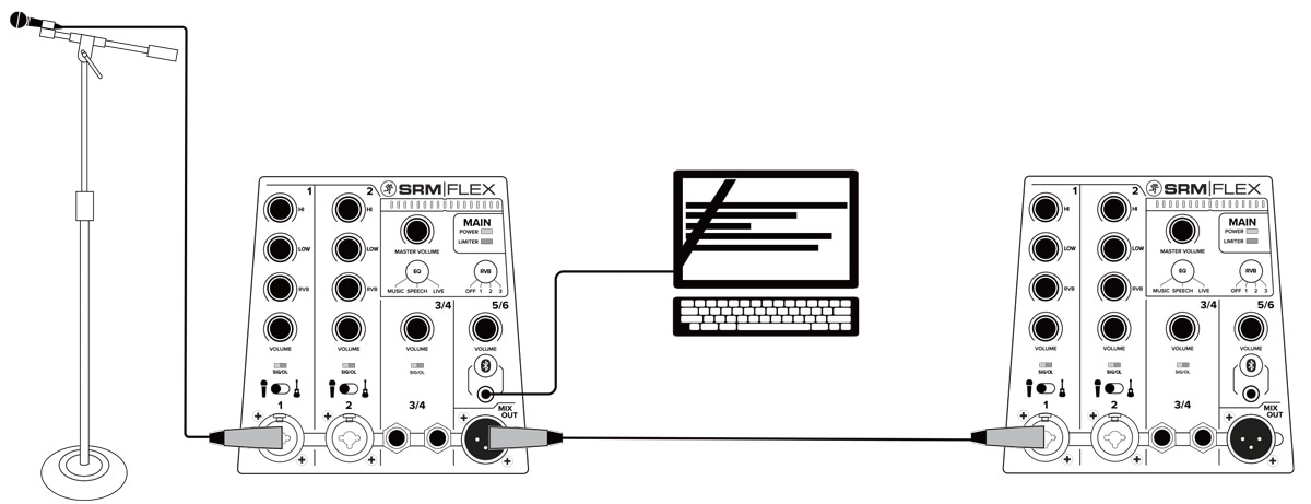 また、MIX OUT 端子にXLR ケーブルを接続し、もう一台のSRM-Flex のCh.1 入力に接続しましょう。