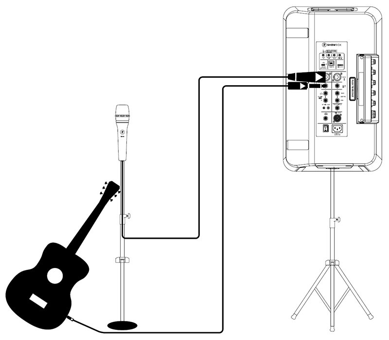 この例では、ストリートミュージシャンの主人公が信頼性の高い Mackie EM-89D ダイナミックマイクをチャンネル 1 の XLR 入力に、ギターをチャンネル 2 の入力に接続します。ここから、チャンネル 1 と 2 の入力を必要に応じて設定します。これには、ゲイン/ボリュームレベル、EQ 設定、コンプレッサーレベル、FX(1 と 2)、その他多数の機能が含まれます。2 ボタンフットスイッチ(ShowBox Footswitch)をお持ちの場合は、フットスイッチジャックに接続して FX のオン/オフを切り替えたり、ループを追加したりできます。