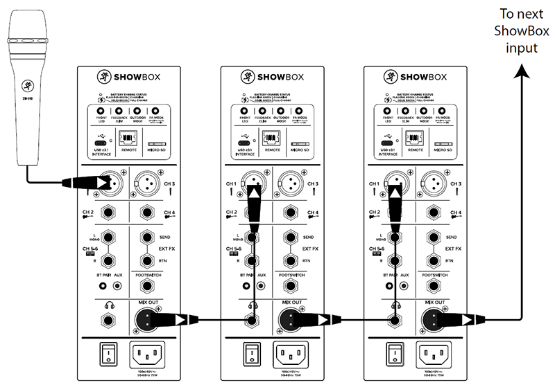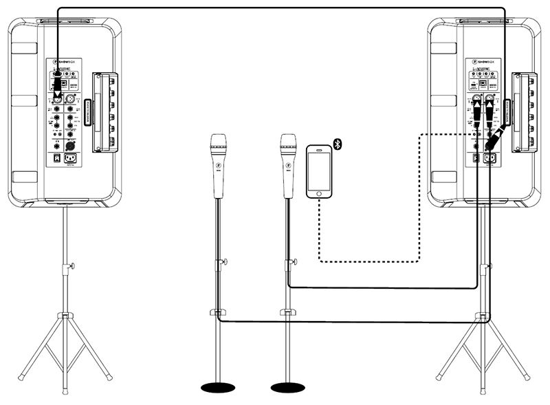 この例では、カラオケ愛好家たちが、信頼性の高い Mackie EM-89D ダイナミックマイクをチャンネル 1 とチャンネル 3 の XLR 入力に接続します。ここから、チャンネル 1 と 3 の入力を必要に応じて設定します。これには、ゲイン/ボリュームレベル、EQ 設定、コンプレッサーレベル、FX(1 と 2)、その他多数の機能が含まれます。さらに、白熱したカラオケ対戦のために、スマートフォンを Bluetooth で接続しています。XLR ケーブルがメインの ShowBox を追加の ShowBox に接続し、パワフルなステレオペアシステムを構築できます!