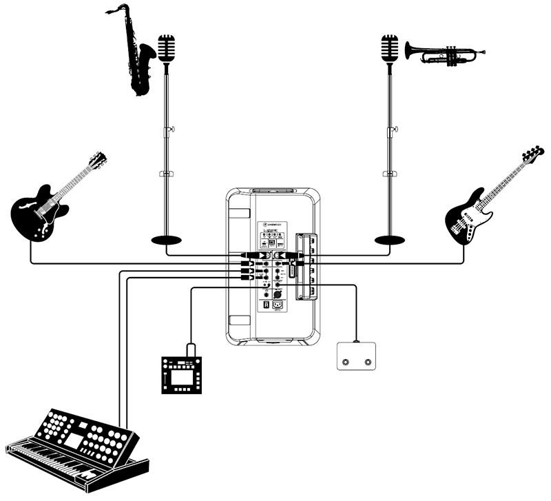この例では、ファンクバンドが「グルーヴをかましたい」と思っています!ホーンセクション用に、2本のマイクがチャンネル 1 と 3 の XLR 入力に接続されています。6弦を操るギタリストはチャンネル 2 の入力に、重低音を出すベーシストはチャンネル 4 の入力に接続されています。シンセサイザーはチャンネル 5-6 のステレオジャックに、ドラムマシンは 1/8 インチの aux 入力に接続されています。最後に、フットスイッチがフットスイッチジャックに接続され、FX のオン/オフを切り替えたり、ループを追加したりできるようになっています。ここから、すべてのチャンネル入力を必要に応じて設定します。これには、ゲイン/ボリュームレベル、EQ 設定、コンプレッサーレベル、FX(1 と 2)、その他多数の機能が含まれます。