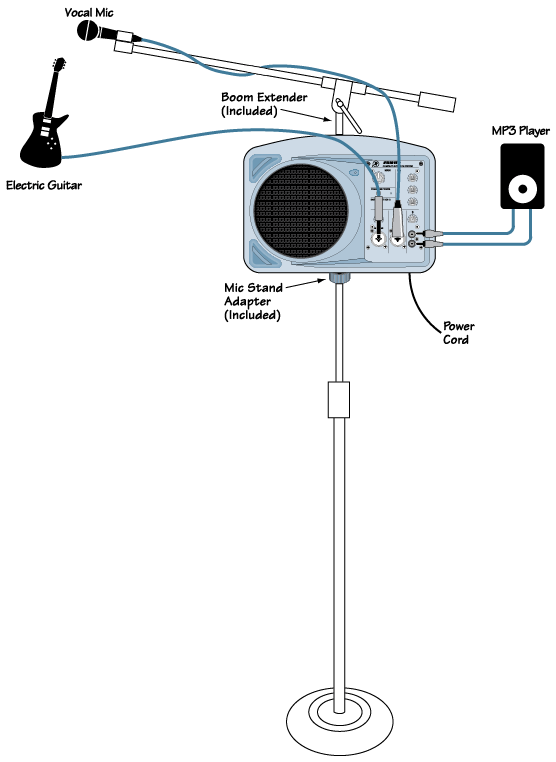パーソナルモニターに使う方法です。付属のマイクスタンドアダプターでSRM150 をマイクスタンドに取り付けます。ブームエクステンダーをSRM150 の天面に付ければ、マイクブームをマウントすることができます。SRM150 にマイクと楽器、チャンネル3 にMP3 などの再生機器をそれぞれ接続してください。