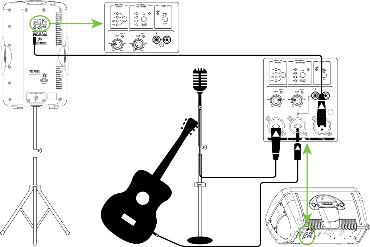 SRM450v3はメイン PAスピーカーとして使用しています。 接続は簡単で、 SRM350v3 スピーカーのTHRU ジャックと SR- M450v3 スピーカーのインプットチャンネル1を接続します [Gainノブは"Line"にセット]。 このとき SRM350v3 の Ch1 / Mix スイッ チが押し込まれ" MIX" にセットしてください。 こうすることで、ボーカルとギターのミックスされた音がメイン PAスピーカーから 再生されます。