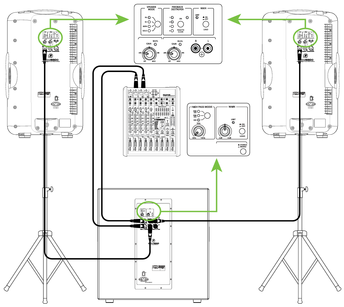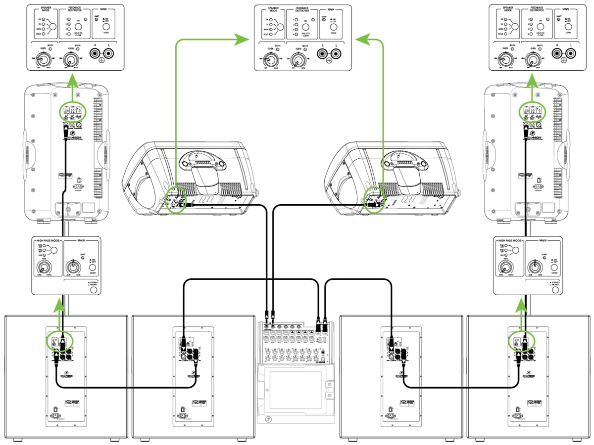 最後に接続した2台のSRM1850サブウーファーのHigh PassアウトプットはメインのSRM450v3フルレンジスピーカーのチャンネルインプットに接続します。。 SRM450v3のGainノブは必ずLine (またはその付近) に設定してください。 SRM1850のHigh Pass モードをVARにセットしてすぐ下のノブを120Hzにあわせるとスピーカーシステムをマッチングできます。