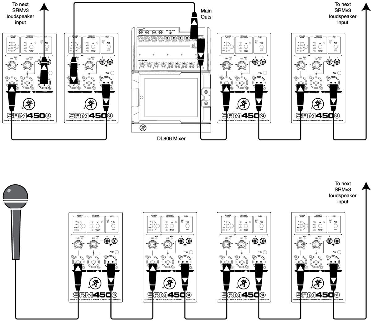 SRMv3スピーカーは"THRU”と記載されたXLRオスコネクターを介してデイジーチェーン接続できます。 シグナルソース(ミキサー のアウトプットなど) をインプットジャックに挿し込み、 SRMv3 スピーカーのTHRUジャックを次のSRMスピーカーのインプットジャックに挿し込みます。 さらにスピーカーを追加する場合は、 同様の手順を繰り返すことで、 複数のSRMスピーカーをデイジーチェーン接続できます。 Ch1/Mixボタンは上に突き出た状態であることを確認してください。 上の接続図をご覧ください。