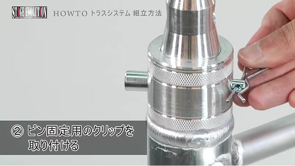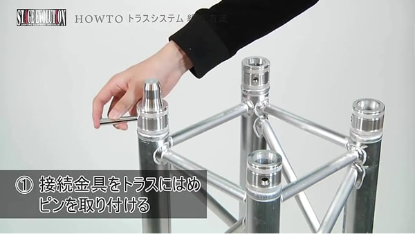 (1). 接続金具をトラスにはめ、ピンを取り付ける