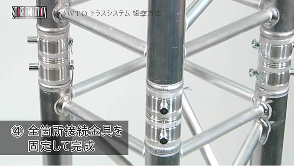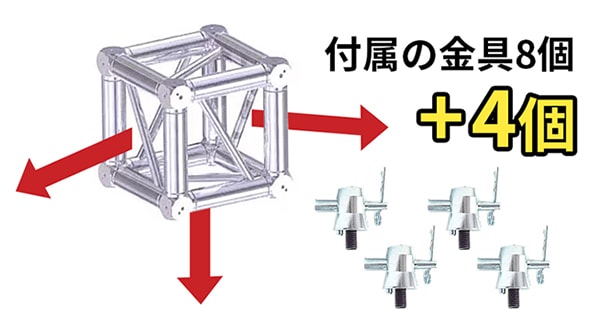 コーナーは、ボックスコーナーを使用します。このコーナーは、任意の方向にトラスを接続できます。しかし、付属の接続金具が8個であるため、3方向以上の接続を行う場合には1方向につき接続金具を4つ追加してください。接続金具もサイズによって異なるので注意しましょう!今回の場合だと、4つのコーナーすべてが3方向の接続になるため、4×4=16個の接続金具を追加します。
