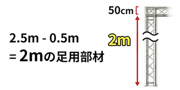 高さを出す足の部分ですが、こちらは片側にしかコーナーがないため、希望の高さ-50cmの直線部材を選びます。今回だと、2mの部材になります。