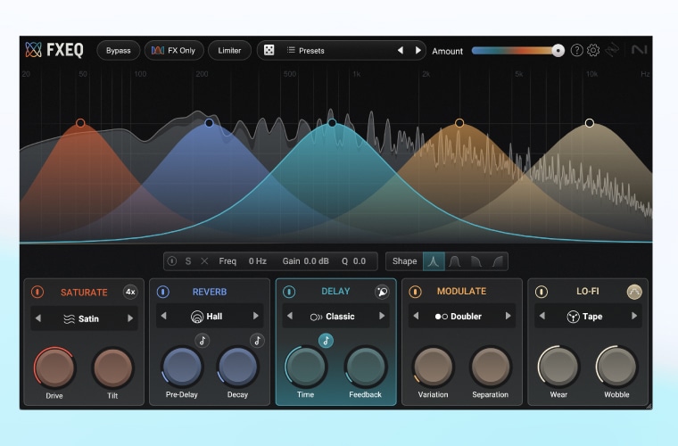 FXEQは、ドライブ/奥行き/質感を思いのままに加えられる5種類の強力なクリエイティブ・エフェクトを革新的な”EQワークフロー”で自由自在に操作することができます。