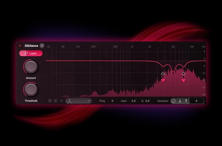 上段のSibilanceチャンネルには、フル機能を備えた6バンドのダイナミックEQを搭載。「Learn」ボタンをクリックしトラックを再生するだけで、シビランス周波数を即座に検出し最適なEQノードを自動設定。耳障りな歯擦音をコントロールしてくれます。