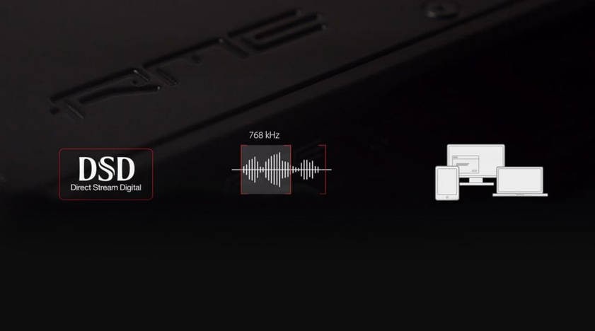 PCMは最大768kHz/32bitの再生に対応。DSDは最大11.2MHzの再生に対応します。USBやSPDIF入力からDSD信号が入力されるとDACがDSDモードに自動で切替ります。DSDネイティブ再生に対応し、可聴帯域外ノイズを抑える高周波ノイズ・フィルターを搭載します。