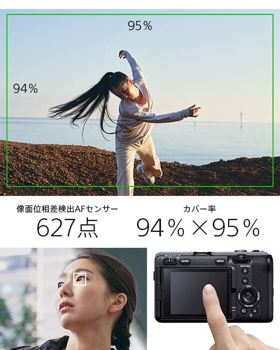 FX3には、像面位相差AFを搭載。動画時627点(静止画時759点)の像面位相差検出AFポイントは画面の約89%をカバーし、被写体を捉え続けます。もちろん、リアルタイムトラッキングやリアルタイム瞳AFも搭載。細やかなAFトランジション速度、AF乗り移り感度や、液晶パネル上で狙った被写体をタッチしフォーカスを自動追尾させるタッチトラッキング、マニュアルフォーカス中のAFサポートにも対応しています。さまざまな撮影条件下で、安定したAF性能と多彩なフォーカスワークを提供します。