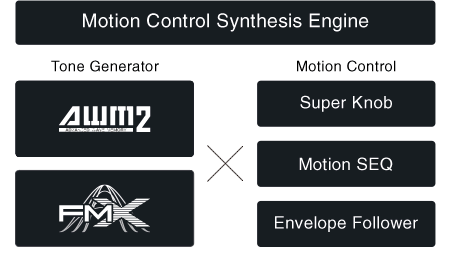 AWM2 + FM-Xのハイブリッド音源と、さまざまなコントロールソースで複雑な音の連続変化を実現する「Motion Control」を組み合わせたシステムを搭載。
