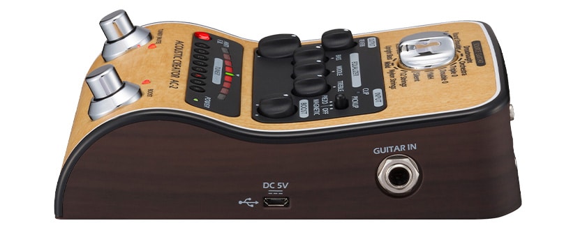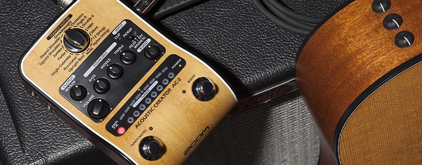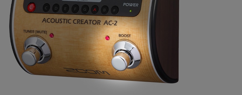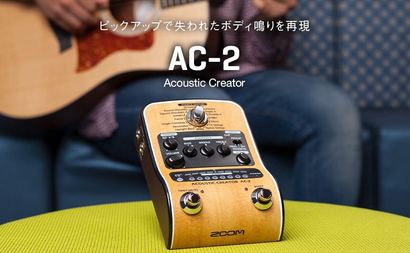 ZOOM『AC-2』は、ピックアップを通すことで失われてしまうアコースティックギターの自然なボディ鳴りを再現する「アコースティック・リモデリング」機能を搭載した、DI機能付きの高品位プリアンプ。