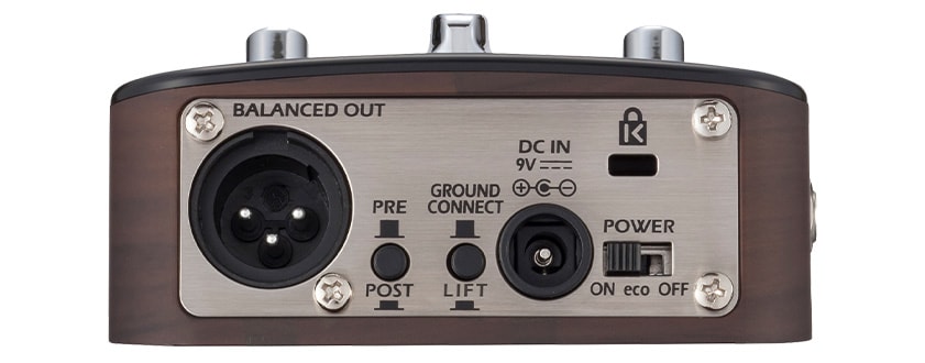 グランドリフト・スイッチ、プリ/ポスト切替スイッチ付きのXLRバランスアウトを装備。DIボックスを使わずに、PAシステムやレコーディング・スタジオのミキシングコンソールに直結することが可能です。また、2系統の標準フォーンジャック(モノ/ステレオ)を備え、ギターアンプやレコーダー等に接続できるほか、ヘッドフォンを接続して、手軽にサウンドチェックを行うことも可能です。