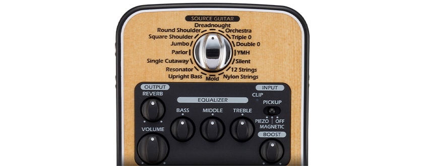 ボディの材質、形状、構造によって異なるアコースティックギターの音響特性をシミュレートした、16種類のソースギター・プリセットを内蔵。ドレッドノート、ラウンドショルダー、オーケストラ、12弦ギター、ナイロンギター、アップライトベースなど、使用するギターに合わせてプリセットを選び、ピックアップの種類(ピエゾ/マグネティック)を選択することにより、ギター本来のナチュラルなトーンを再現。