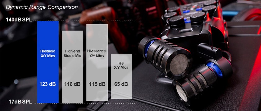 直径19.4mmの大口径ダイアフラムは、最大140dB SPLを実現。爆発音や大きなエンジン音も歪みなく収音できます。スタジオクラスのプリアンプと合わせて、マイク一体型レコーダー史上最大(当社比)のダイナミックレンジ123dBを実現しました。全帯域でのフラットな周波数特性と合わせて、正確無比なステレオ収音が可能です。