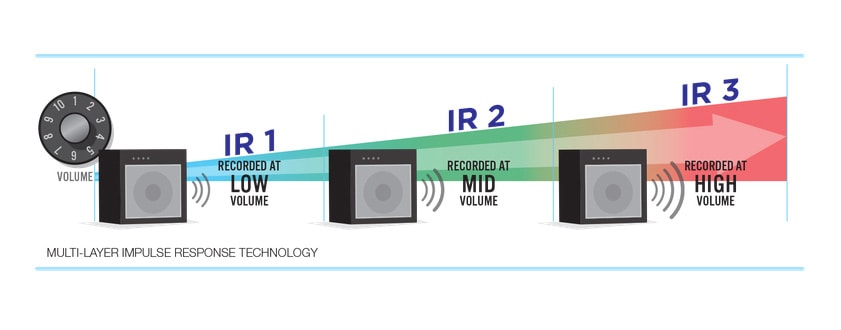 従来の一般的なIRは、スピーカー・キャビネットの特性を捉えるために、単一のインパルス応答が使用されています。ZOOMの革新的な「マルチレイヤーIR」テクノロジーでは、LOUD / MEDIUM / SOFTの異なる音量で取り込まれた3 つのインパルス応答を採用。3つのIRはベースの音量やピッキングの強弱に応じて動的にブレンドされ、現実のキャビネット同様の反応で、これまでとは別次元の忠実かつ有機的な響きを生み出します。