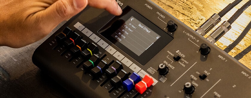 リバーブ、コーラス、ディレイのセンドエフェクト・チャンネルを搭載し、専用のエフェクトリターン・フェーダーも備えています。ギター/ベースのアンプモデリングなどのインサートエフェクトも内蔵し、PC/Mac用アプリ「Guitar Lab」から追加のエフェクトやプリセットをオンラインで入手することも可能。