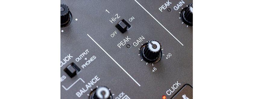 INPUT1にはギター/ベースをダイレクトに接続できるHi-Z入力スイッチを装備。