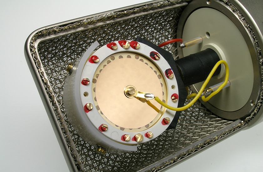 TLM 67はNeumannマイクの中でも珍しい特別なカラーリングが標準採用され、スタイリッシュなパールグレーのボディーを組み合わせた独自の二色の色使いでレトロな雰囲気を出しています。2008年にリリースされたTLM 67の前面には、Neumann創設80周年を記念して、創業者Georg Neumannの名前入りのメタルエンブレムが取り付けられています。本体は、Neumannのアイデンティティでもある木箱に収められています。