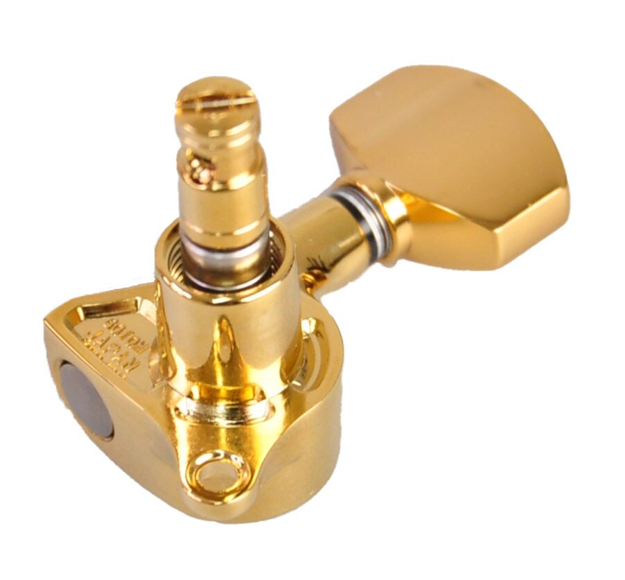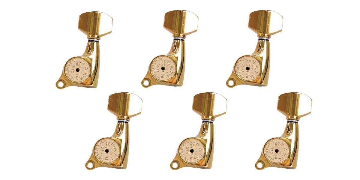GOTOH製、ペグ配列R6連のギター用ロックペグ。HAPとMG機構がひとつになったハイトアジャスタブル・マグナムロック仕様、A07ボタン、カラー:ゴールド。