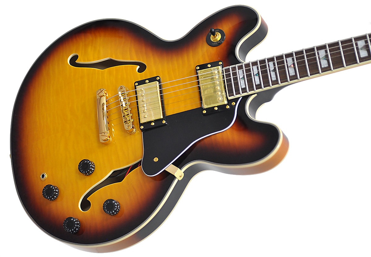 2本目のSA500です。1本目はチェリーレッド今回はサンバーストを購入しました。安定の音です。セットネック、センターブロックのホロウボディーの音はしっかりしてます。控えめなパワーのピックアップはエフェクターのノリが良いですね。普通3万円以下でセミアコは買えませんよ。だからといって品質が悪いわけではありません。悪かったらリピ買いしてないですからね