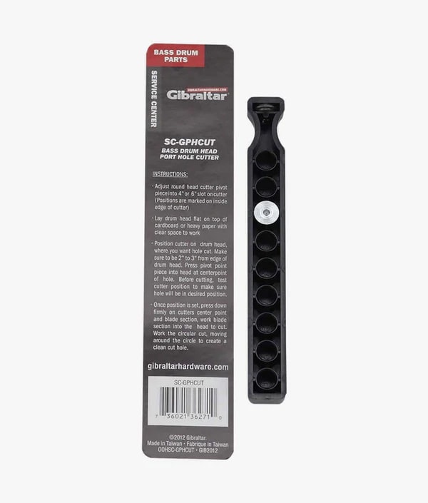 バスドラムヘッドにマイク用の穴を開けたいけれど、カッターで切るのは怖い…。失敗したら取り返しがつかない…。というときにお勧め。このホールカッターを使えば、簡単に綺麗な丸い穴をあけることができます。先端の金色の部分がカッターになっているので手を切らないように注意。内側にある銀色の丸いのが針になっているので、ここを刺して穴の中心を設定します。このときドラムヘッドの裏側から当てるのがよいです、表だとペコペコしてうまくできない!(HOWTO動画を見ててなんでだろうと思ったけどよくよく考えたら当たり前ですよね笑。)本体をドラムヘッドに押し付けて、少し体重をかけてくるくるっと回せば、簡単に綺麗なホールを空けることができます!銀色の針の位置を変えることによって、ホールの大きさを2インチ~10インチの好みの大きさで調整できます。女子ドラマーにはちょっと大変かもしれないけれど、普通の一般的なカッターで切るよりいいでしょう?(笑)好きなアーティストのホールの位置を真似したいとき、気に入ったバスドラムヘッドがホール無しだったとき、是非使ってみてください!!