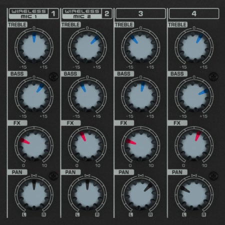 チャンネル1~4は、その透明性とヘッドルームで称賛されている、高品質な「インビジブル」マイクプリアンプ(IMP)を搭載しています。クリップLED付きのレベルコントロールが提供されているため、通常よりも「ホット」な入力レベルに対処しなければならない場合に、完璧な信号レベルを設定できます。さらに、各チャンネルには専用の2バンドEQ(低音と高音)、パンまたはバランス(ステレオイメージ内の好きな場所に信号を配置できます)、そしてFXレベルコントロールがあります。