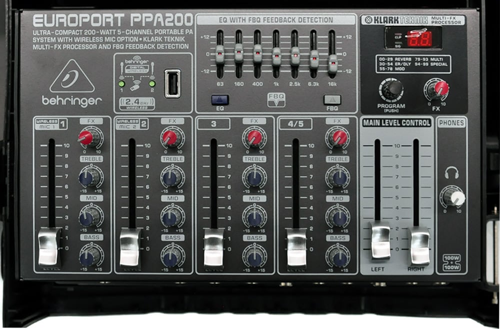 EUROPORT PPA200は、あらゆる小規模から中規模のイベントに必要なものをすべて提供します。軽量でありながらパワフルな「専用ワイヤレス(別売)対応」5チャンネルミキサーアンプで、マイク2本、MP3プレーヤー、または最大5つの楽器を接続できます。FBQフィードバック検出機能を備えた内蔵ステレオ7バンドグラフィックEQで、すべての音を微調整できます。
