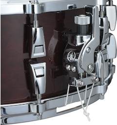 Absoluteシリーズのスネアドラム「AMS1460」の大きな特徴は、やはりシェルの材構成です。シェル材として定番の乾いた明るいサウンドを得ることができるメイプルの間に硬いウエンジを挟み込むことにより、明るいメイプルらしい倍音かつ引き締まったサウンドを実現しています。シェルのエッジには角度の浅い45°/R1.5を採用し、低域の効いた迫力のあるサウンドを叩き出すことができ、叩いていて心地よさを感じることができるモデルです。