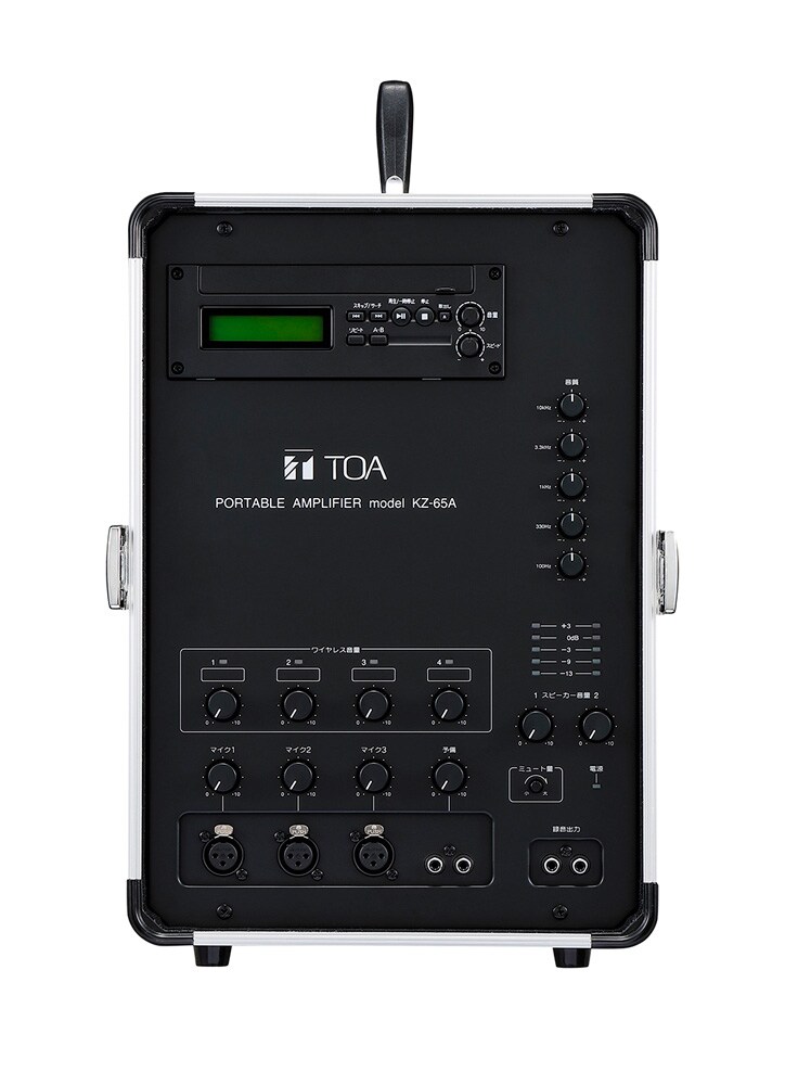 持ち運びに便利なアルミケースに収納でき、スピード可変のCDプレーヤー、800MHz帯ダイバシティワイヤレスチューナーユニットを内蔵し、さまざまなシーン、広さのイベントや行事の移動用音響システムとして利用できるポータブルアンプシリーズKZ-65A/30A/25A。