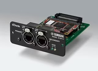 NY64-Dは先進のネットワークオーディオ規格「Dante」に 対応したTFシリーズ用拡張カードです。48kHz/24bitの デジタルオーディオ信号を、最大64チャンネル送受信可能 です。I/Oラック Tio1608-Dと組み合わせて最大48IN/24 OUTのステージボックスシステムを構築することができます。