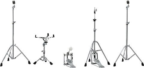 高さ調整が可能な別売のハードウェアセット「HWJK」。軽量ながら安定性に優れたシングルブレースデザインのスタンドとフットペダルを含みます。小口径用スネアスタンドおよびハイハットスタンドは、ローポジションでの演奏に対応した高さ調整が可能な特別仕様です。