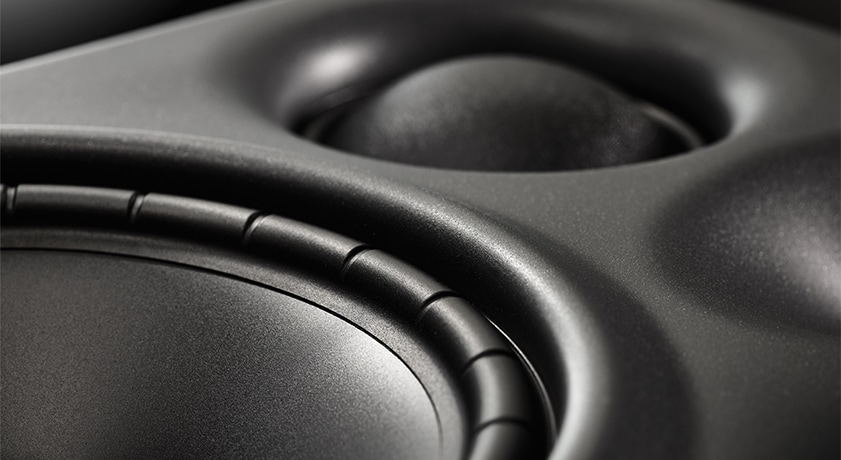 コンピューター・シミュレーションによるキャビネットデザインの恩恵は低域にとどまりません。特徴的なツイーター周囲のくぼみはMMDウェーブガイドで、音が広がる角度(指向性)を緻密にコントロールしています。
