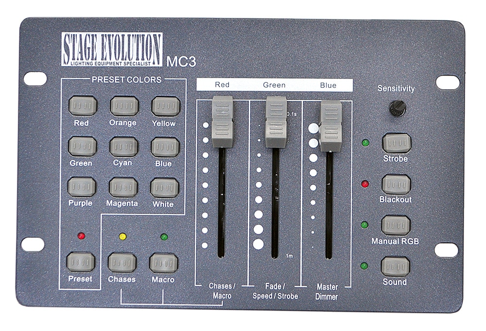 MC3は、コンパクトで持ち運びに便利なDMXコントローラー。小さなボディの中には豊富な機能を搭載。4種類の動作モードと9種類のプリセットカラーを装備し、ボタンをワンプッシュするだけで、簡単にチェースやカラーを呼び出すことができます。RGBタイプのLEDパーライトやウォッシャーのコントロールに最適。ちょっとした照明演出やホームパーティーの照明コントロールなどに最適なDMXコントローラーです。