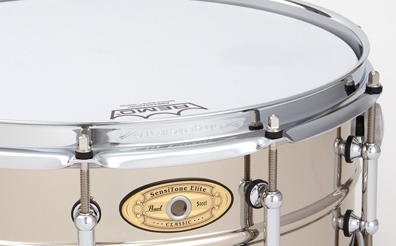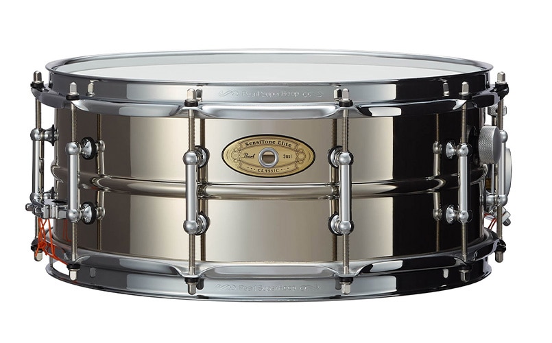 指1本でも触れたら指紋がついてしまう…と思わせるくらいに綺麗な見た目をしているこのスネア、「Sensitone Elite」の名前の通りエリート感が漂う優秀なスネアです。日本限定のこのモデルは、スチールシェルが1mm厚で、ニッケルメッキを施されています。フープやスナッピーなどのパーツをクラシックタイプやメッキレスなど信用のあるもので揃えることで、良い意味で「メタルシェルらしくない」スネアに仕上がっています。サイズは14" x 5.75"という、あまりお目にかかることのない、若干深めの胴を採用。メタルシェルのスネアはうるさくて自分の音楽に合わない、という方もいらっしゃるかと思いますが、このスネアなら太い音が鳴るので、ウッドシェルのような温かみとメタルシェルのような音量を稼げます。イチ推しのスネアです!
